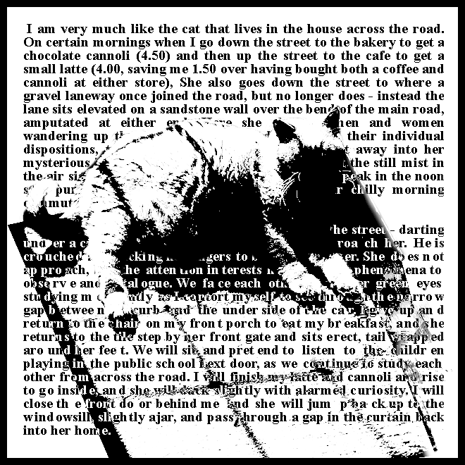 I am very much like the cat that lives in the house across the road. On certain mornings when I go down the street to the bakery to get a chocolate cannoli (4.50) and then up the street to the cafe to get a small latte (4.00, saving me 1.50 over having bought both a coffee and cannoli at either store), She also goes down the street to where a gravel laneway once joined the road, but no longer does - instead the lane sits elevated on a sandstone wall over the bend of the main road, amputated at either end. Here she observes men and women wandering up the footpath on the road, and notes their individual dispositions, tallying their number up and filing it away into her mysterious interior record. It is a cold morning, but the still mist in the air signals a sweaty humidity that will reach its peak in the noon sun, punishing those below her dressed for their chilly morning commutes.