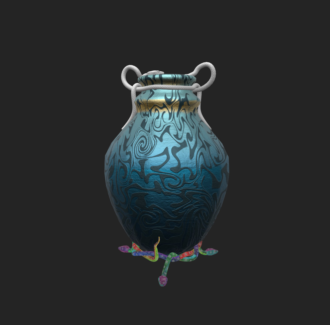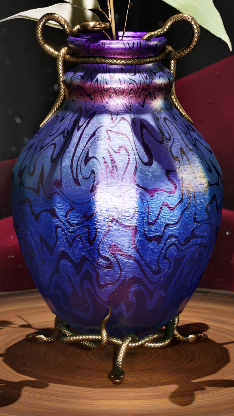 The vase has a 2-layer topology. A painted, base layer and a uniform clearcoat layer for glints and iridescence. The base layer uses a specular profile to twist the reflected specular light towards a deep purple at about 63 degrees incidence. The top layer uses a thin-film iridescence function based on the painted normals to add iridescent haloing around the acid etching in the 'waves' printed onto the vase. There is also a very slight glint added to give a speckled appearance under direct light.